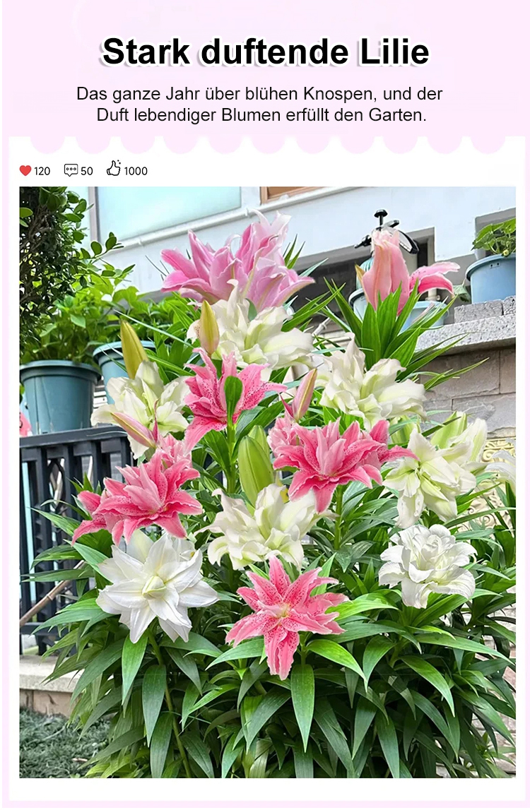 Pflanzen Sie jetzt diese mehrblättrige Lilie mit einer Blütezeit von über 300 Tagen und schon nächsten Monat haben Sie ein ganzes Blummenmeer! Der Duft ist sogar 20-mal besser als der teuerste Luxusparfüm!